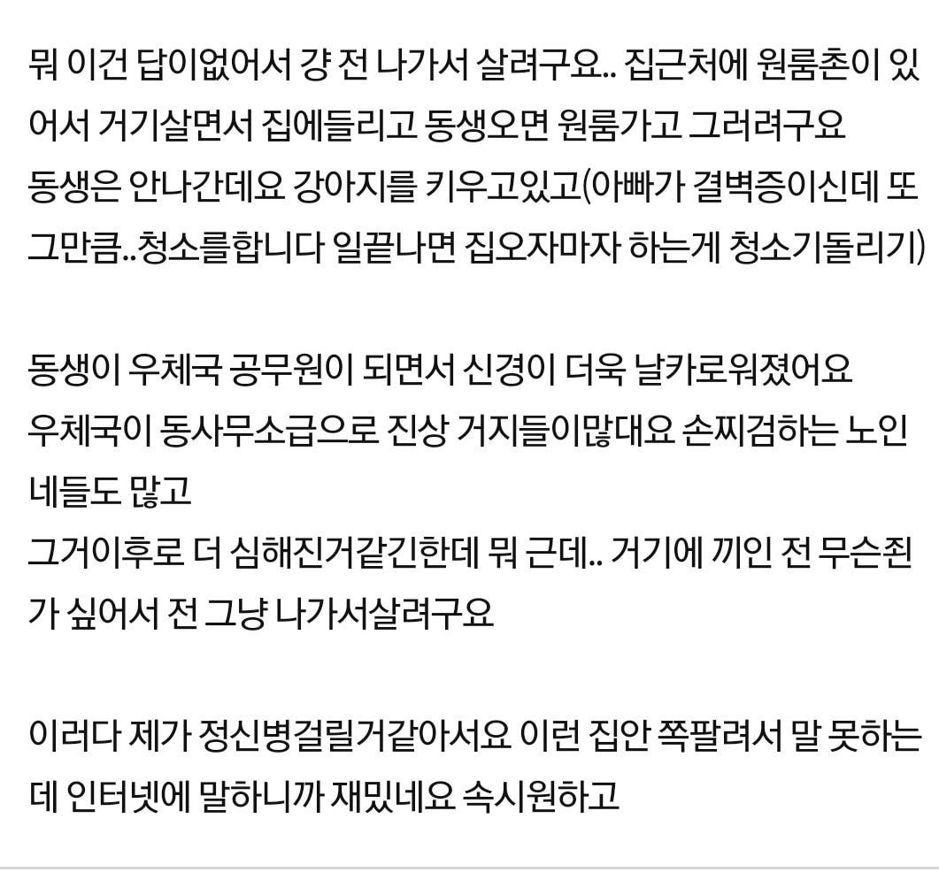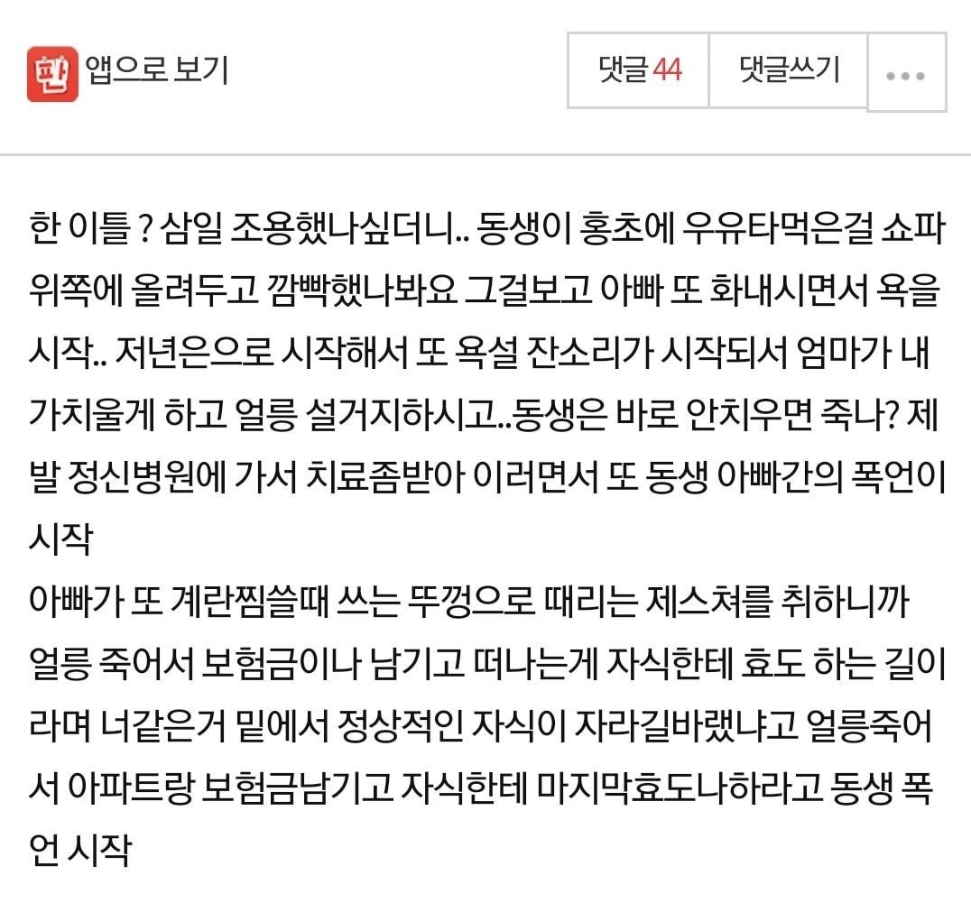 하지만 A씨의 동생은 지지 않고 더 안치우며 아빠게 “나중에 나이먹어서 요양원에서 쓸쓸히 죽기 싫음 자식새끼한테 잘해라 니네 아빠(할아버지)도 치매로 죽었는데 그렇게 가고 싶냐” 등의 폭언을 내뱉는다.