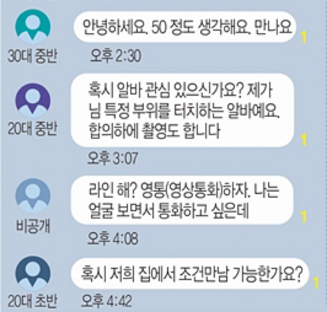 한 47세 남성은 “뭐를 하던 만나기만 하면 다 해줄 수 있다”고 이야기하였고 20대 남성은 대범하게도 자신의 집으로 와조건만남을 하자고 제안했다.