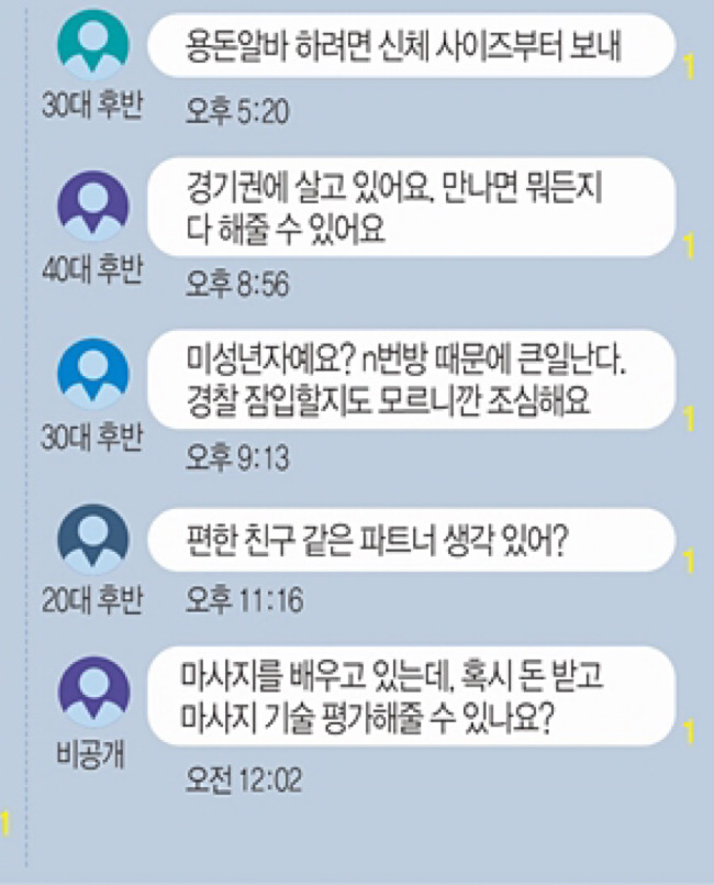 성인 이용자들은 미성년자임을 알고도 “고민이 있느냐”, “만나자”는 등의 접근을 태연하게 걸어왔다.