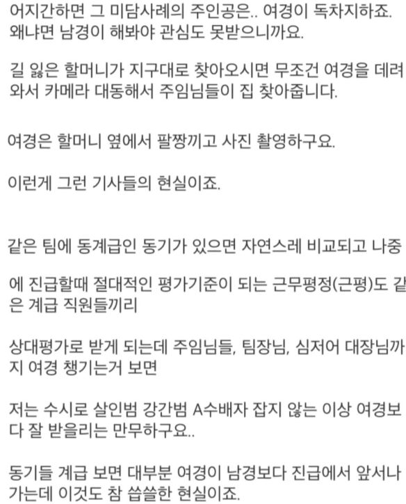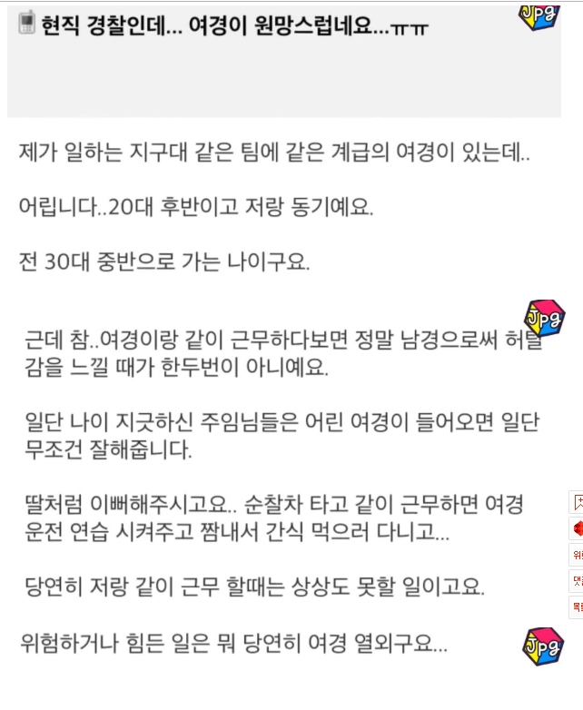 이어 “힘들고 더러운 일은 남경이 하는데 왜 여경은 편한 내근직 들어가서 진급시험을 보려고 하느냐”며 “정말 현장에 뜻 있는 여경이 들어왔으면 좋겠다”고 언급하며 글을 마쳤다.