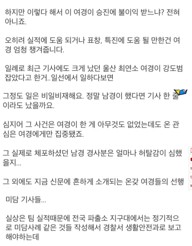 점점 불만이 쌓인 A 씨는 “그렇다고 실적에 도움 되거나, 표창, 특진에 도움 될만한 건 여경을 엄청나게 챙겨 준다”면서 “일례로 울산 최연소 여경 강도범이 잡았다는 사건이 그 사례다”고 덧붙였다.