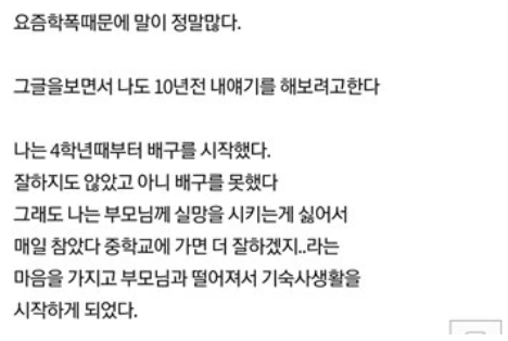해당 글쓴이는 자신이 배구 경기에 참가했던 기록을 인증하며 “요즘 학폭 때문에 말이 많다. 그 글을 보면서 나도 10년 전 얘기를 해보려 한다. 나는 4학년 때부터 배구를 했다. 중학교에 가면 더 잘하겠지라는 생각으로 기숙사 생활을 시작했다”며 말문을 열었다.
