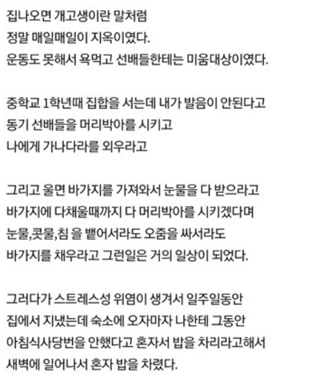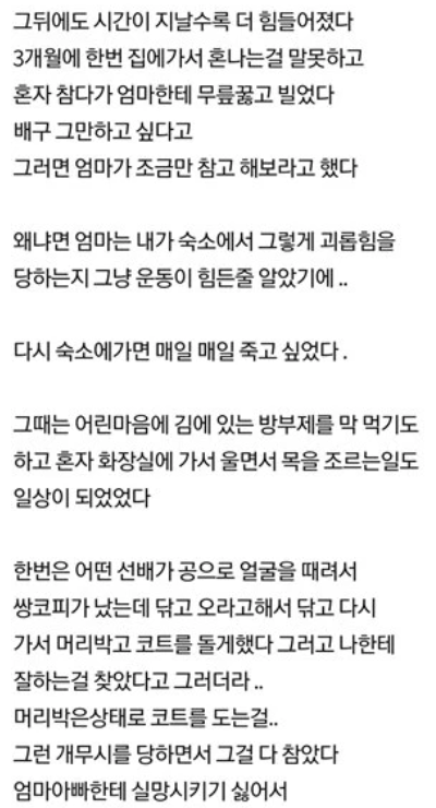 결국 3개월 뒤 ‘배구를 그만하고 싶다’고 부모님에게 무릎꿇고 빌었다. 부모님은 내가 괴롭힘을 당하는지 몰랐기에 ‘조금만 참아’라고 했다. 이후 어떤 선배가 내 얼굴을 공으로 때리고, 머리를 박은 채 코트를 돌게 했다.