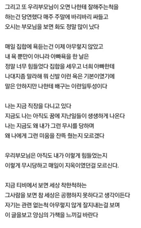 지금도 꿈속에서 지난 일들이 생생하게 나온다. 지금 TV에서 보면 참 세상은 공평하지 못하다는 생각이 든다. TV에 나올 때마다 세상 착한척하는 그 사람이 이 글을 보고 양심의 가책을 느꼈으면 좋겠다”며 마무리했다.