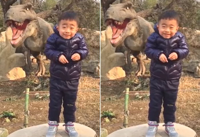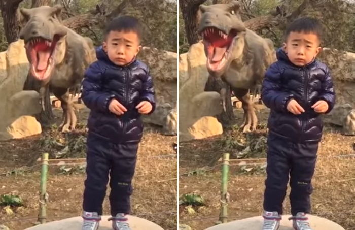 공개된 영상 속에는 한 아기가 사진을 찍으려는 듯 움직이는 공룡 모형 앞에 서 있다.