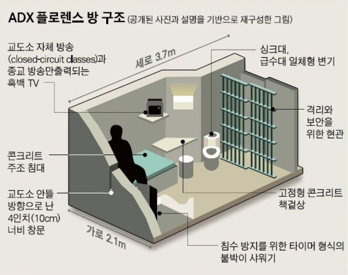 미국 정부 관할로 콜로라도주에 위치한 이 교도소는 미국 범죄자들의 기피 순위 1순위인 ‘ADX 플로렌스 교도소’로 일명 ‘깨끗한 지옥’이라고도 불린다.