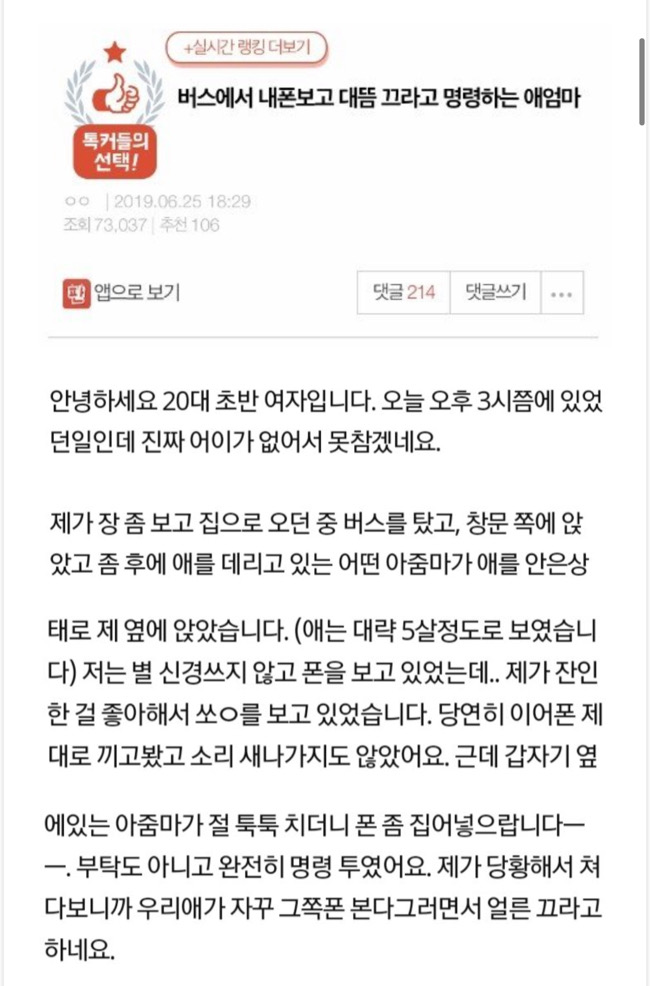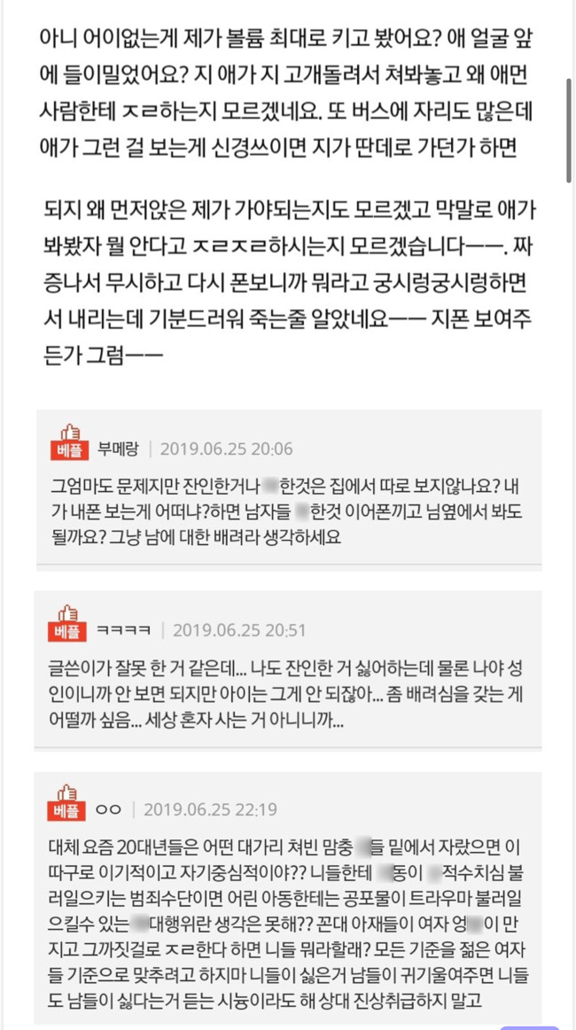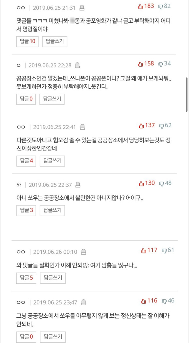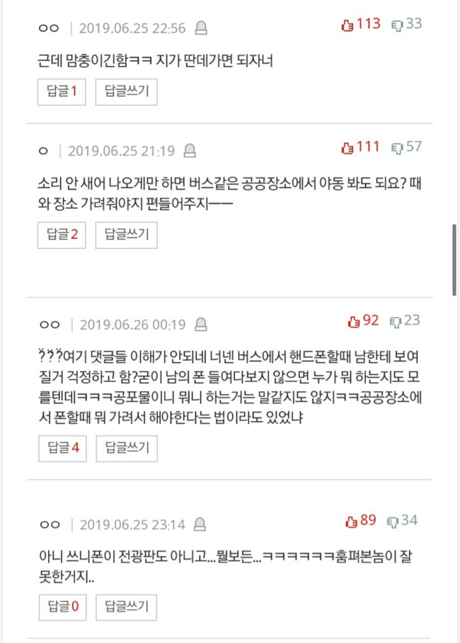 이 같은 글에 누리꾼들은 반반으로 나누어져 “아줌마가 맞는듯, 공공장소에서 그런 영화는 좀..”,”아이들 교육에 안좋다”라는 반응과 “이어폰 꼈고 글쓴이 폰인데 공공폰이 아니잖는가”,”다른 자리도 많았다는데 그럼 거기로 가지” 등의 반응을 보이고 있다.