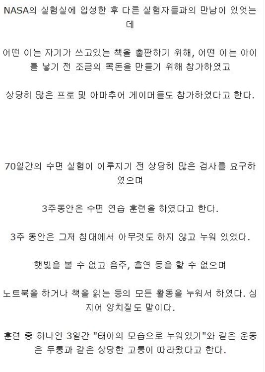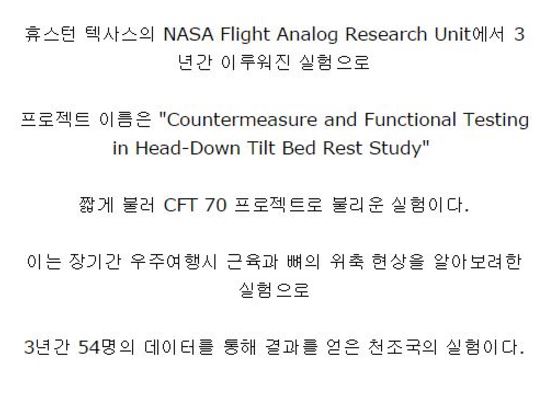 해당 실험은 장기간 우주여행을 할시에 근육과 뼈의 변화를 알아보기 위한 실험인 것으로 밝혀졌다.