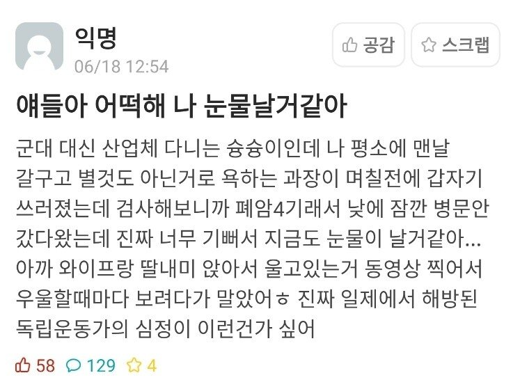 “그런데 너무 행복합니다 아까 과장님 부인이랑 딸이 앉아서 울고 있는 거 동영상 찍어서 우울할 떄마다 보려고 말았습니다. 일제에서 행방 된 독립운동가의 심정이에요.”라며 당시 상황을 전했다.