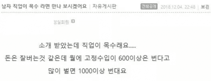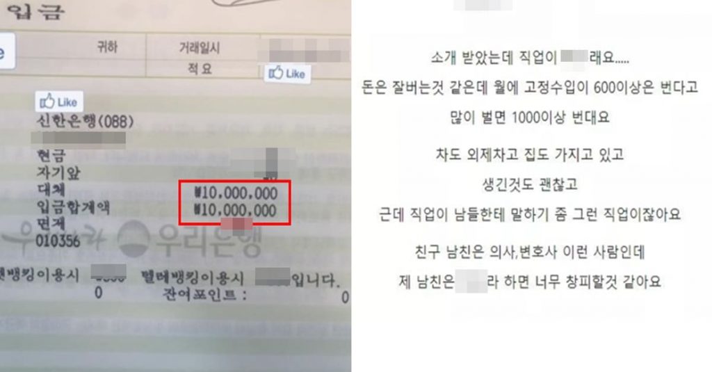 A씨에 따르면 상대방 남성은 월 600이상 고정 수입이고 많이 벌면 1000이상 벌었다.