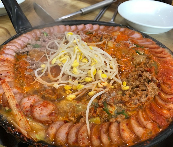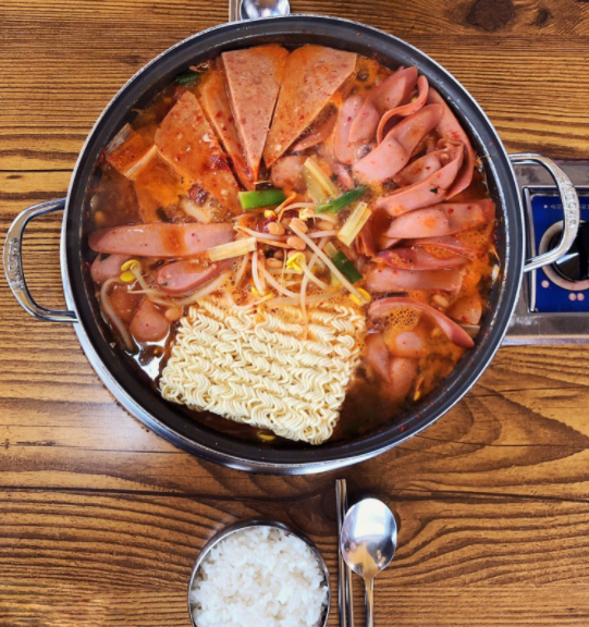 고기 대신 햄과 소시지를 사용한 김치찌개이며, 서양인들에게 인기 있는 대표적인 한국 요리다.