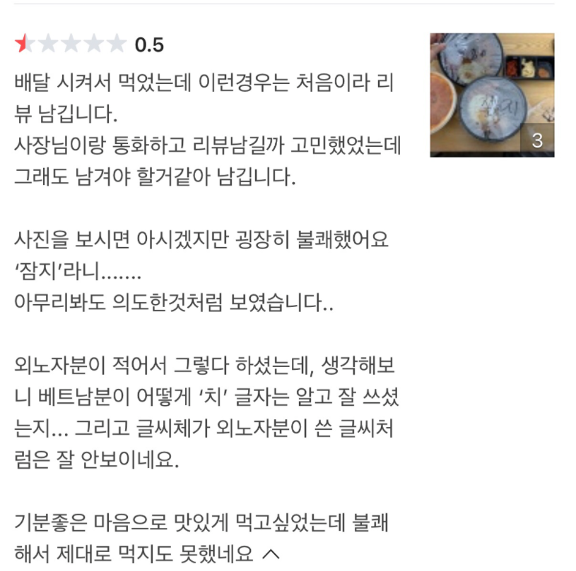 이를 본 온라인 커뮤니티 네티즌들은 “저 정도면 정말 외국인이 근무하면서 단어를 잘 못 적은 것 같은데요?”, “참치를 잠지로 쓴 것 같은데 이게 그렇게 예민하게 받아들일 상황인가요? 저거 때문에 별점 1개라니 너무하네요.”라는 반응을 보였다.