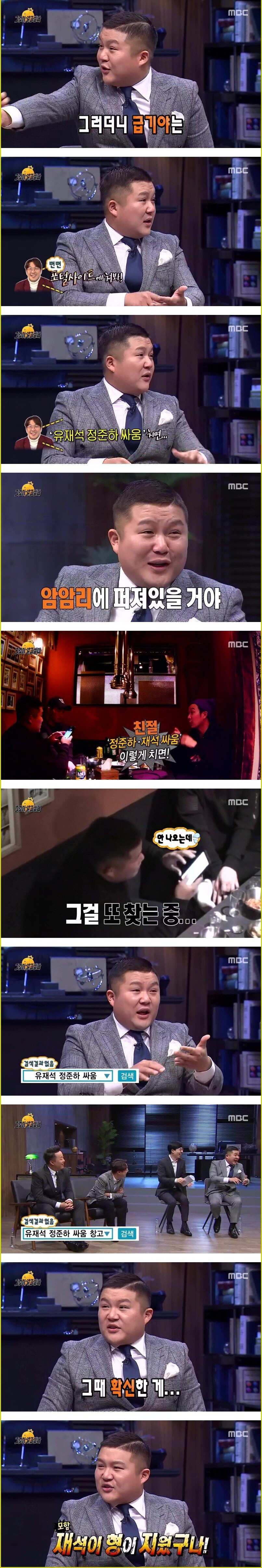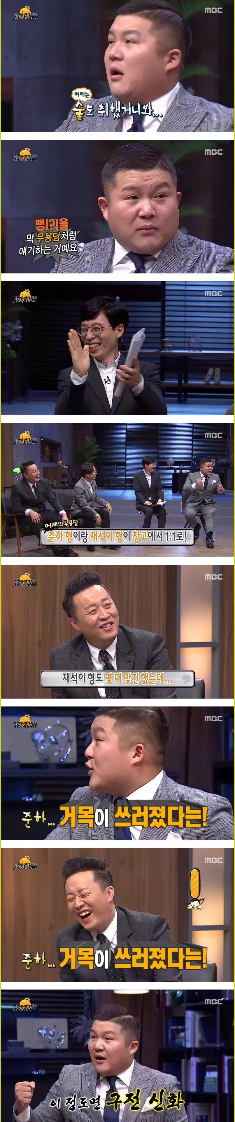뒤이어 출연진들은 방송인 유재석과 방송인 정준하가 창고에서 싸움이 벌어졌는데, 정준하가 쓰러졌다며 방송인 유재석의 싸움실력을 증명했다.