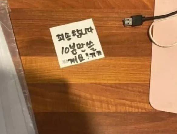 해당 글에 첨부된 사진 속 쪽지에는 “죄송합니다 10분만 쓸게요! ㅠㅠ”라고 적혀있었다.
