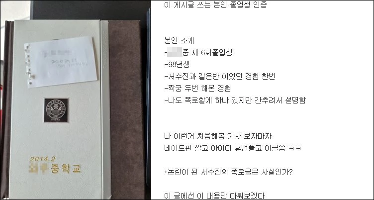 해당 게시글의 작성자는 수진과 같은 중학교 출신이라고 밝히면서 졸업앨범 사진을 함께 첨부해 글을 올렸다.