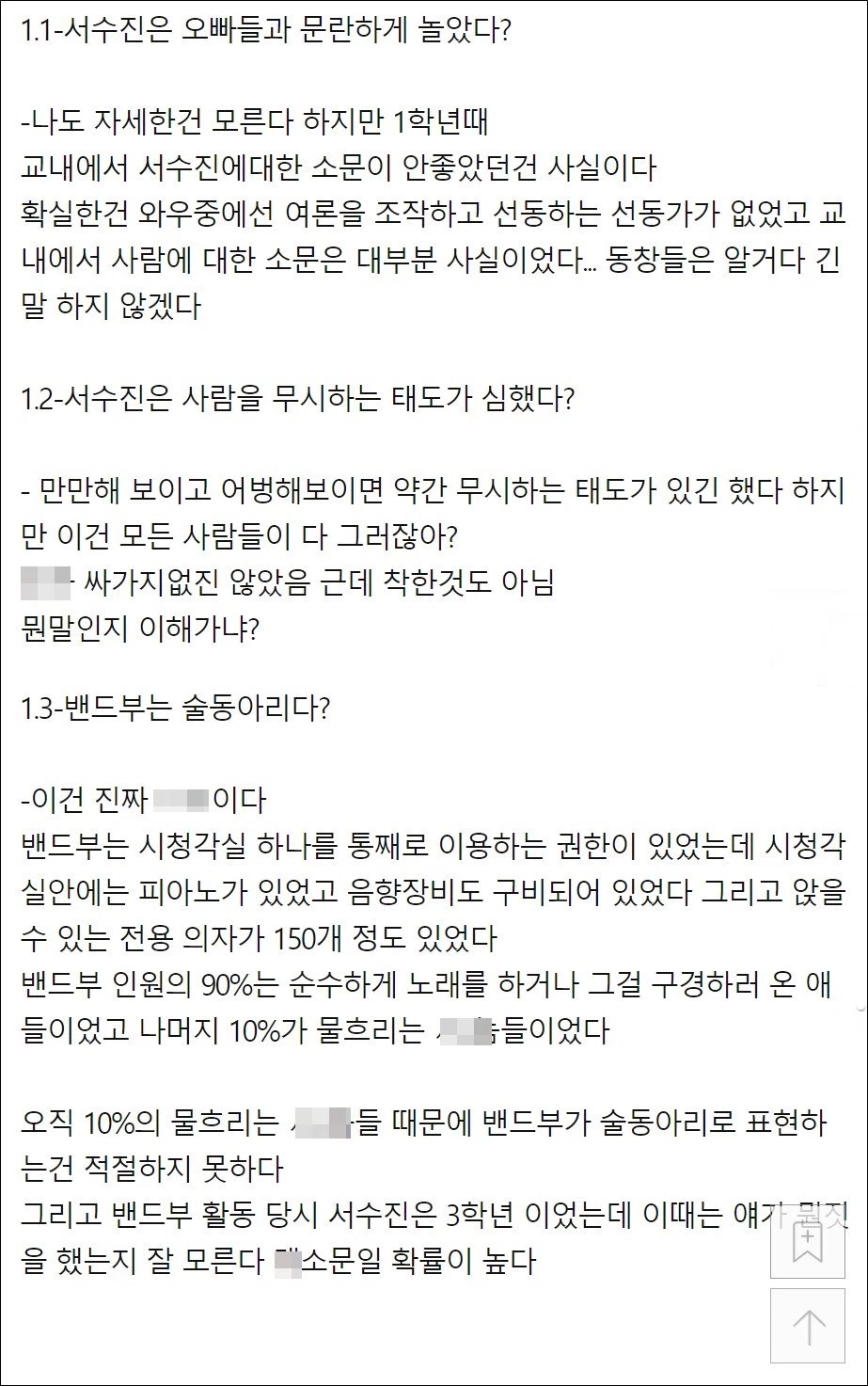 작성자는 먼저 의혹 글에 언급된 이름들이 모두 실제 동창들의 이름과 일치한다면서 “서수진이 오빠들과 문란하게 놀았다는 의혹에 대해 나도 자세한 건 모른다. 하지만 1학년 때 교내에서 서수진에 대한 소문이 안 좋았던 것은 사실이다”라며 회상했다.