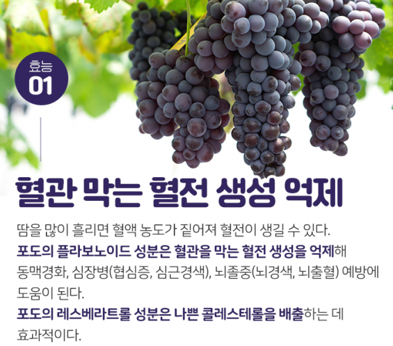 포도의 플라보노이드 성분은 혈관을 막는 혈전 생성을 억제해 동맥경화, 심장병(협심증, 심근경색), 뇌졸중(뇌경색, 뇌출혈) 예방에 도움이 된다.