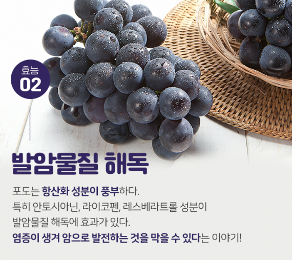 발암물질 해독 : 포도는 항산화 성분이 풍부한데, 특히 안토시아닌, 라이코펜, 레스베라트롤 성분이 발암물질 해독에 효과가 있다.