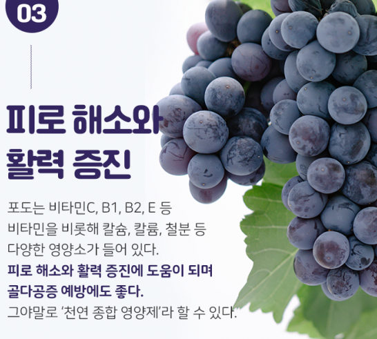 피로 해소와 활력 증진 : 포도는 비타민C, B1, B2, E 등 비타민을 비롯해 칼슘, 칼륨, 철분 등 다양한 영양소가 들어 있다.