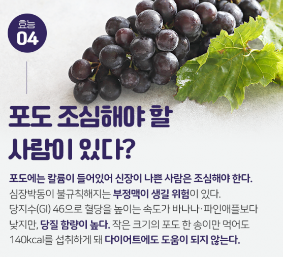포도 조심해야 할 사람 : 칼륨이 들어있어 신장이 나쁜 사람은 조심해야 한다.
