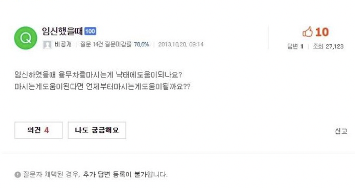 한 지식in에서 질문자가 “임신하였을때 율무차를 마시는게 낙태에 도움이 되나요”라고 묻는 글을 올려 큰 논란이 됐었다.