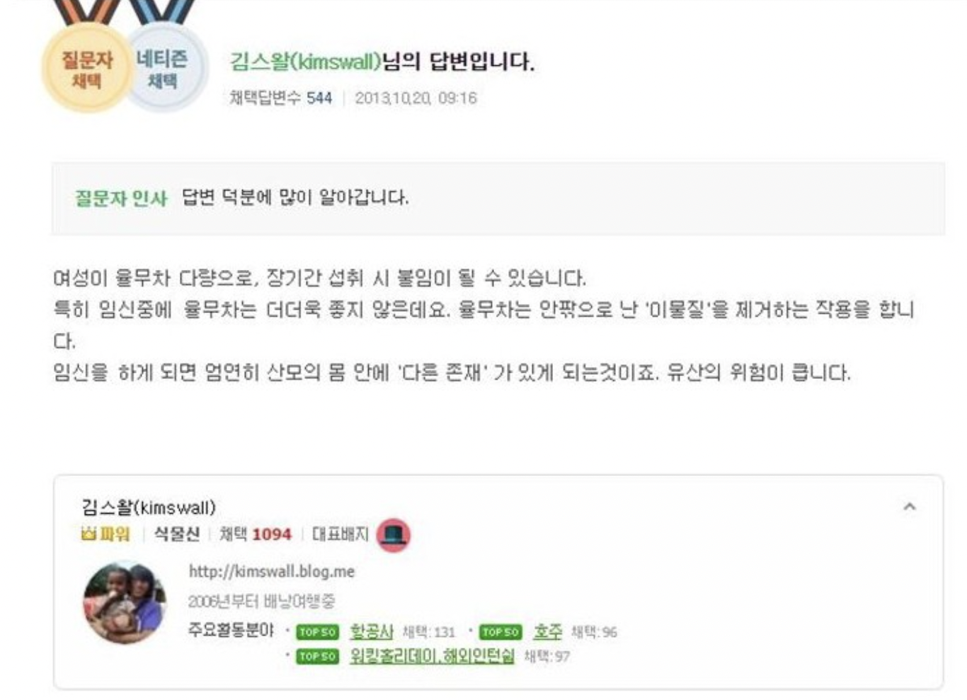 이에한 사람이 답변을 했는데 “여성이 율무차 다량으로 장기간 섭취 시 불임이 될 수 있습니다”라며 “특히 율무차는 안팎으로 난 이물질을 제거하는 작용을 합니다. 임신을 하게 되면 태아마저 떼내는 작용을 할 수 있어 위험합니다”라고 답했다.