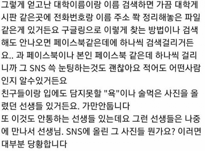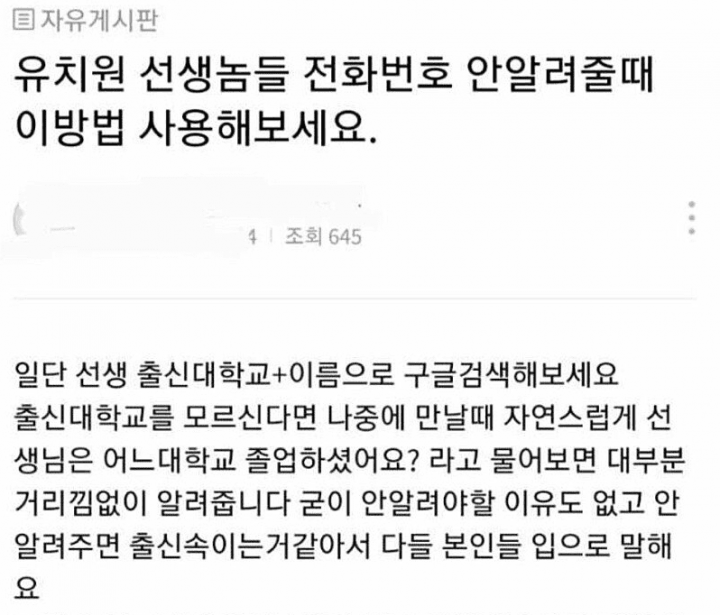 A씨가 제안한 방법은 먼저 선생님의 출신대학교와 이름을 구글에 검색하는 것인데 A씨는 “만약 출신대학교를 모른다면 나중에 만나서 자연스럽게 어느 대학교 나왔는지 물어보면 된다”며 “대학을 알고 나서 대학이름이랑 이름 검색하면 가끔 대학 게시판에 전화번호랑 이름, 주소를 정리해놓은 파일이 있다”고 밝혔다.