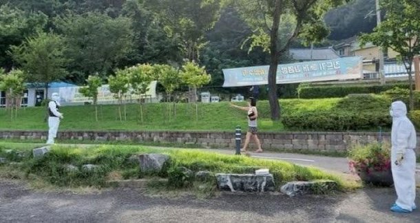 온라인에 급속도로 퍼진 사진을 보면 A씨는 한여름 더위에도 방역복으로 중무장한 보건당국 관계자들과 거리를 두고 대치했다.