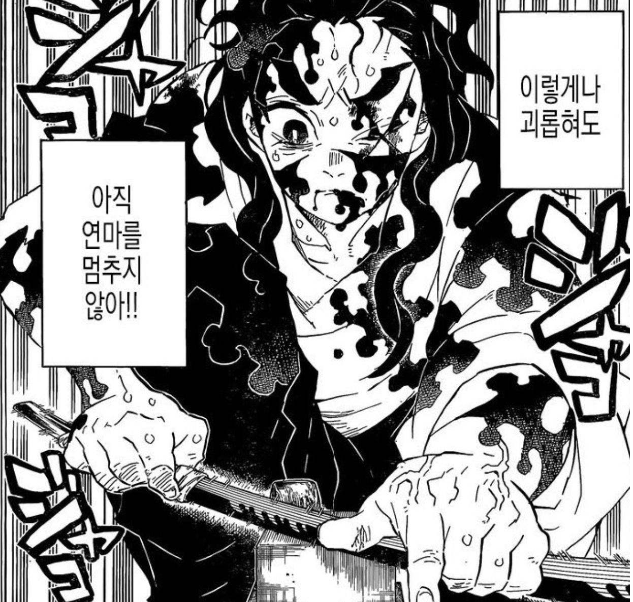 초반에는 탄지로의 일륜도를 건네주기 위해 우로코다키 사콘지의 거처에 찾아와선 탄지로를 무시하고 자기 할 말만 계속하다가 탄지로의 붉은 빛이 도는 머리털과 눈동자를 보고 혁작의 아이라며 붉은 도신을 볼지도 모르겠다고 기대를 품었으나 검은 도신을 보고 짜증을 내면서 탄지로에게 프로레슬링 기술을 걸면서 괴롭힌다