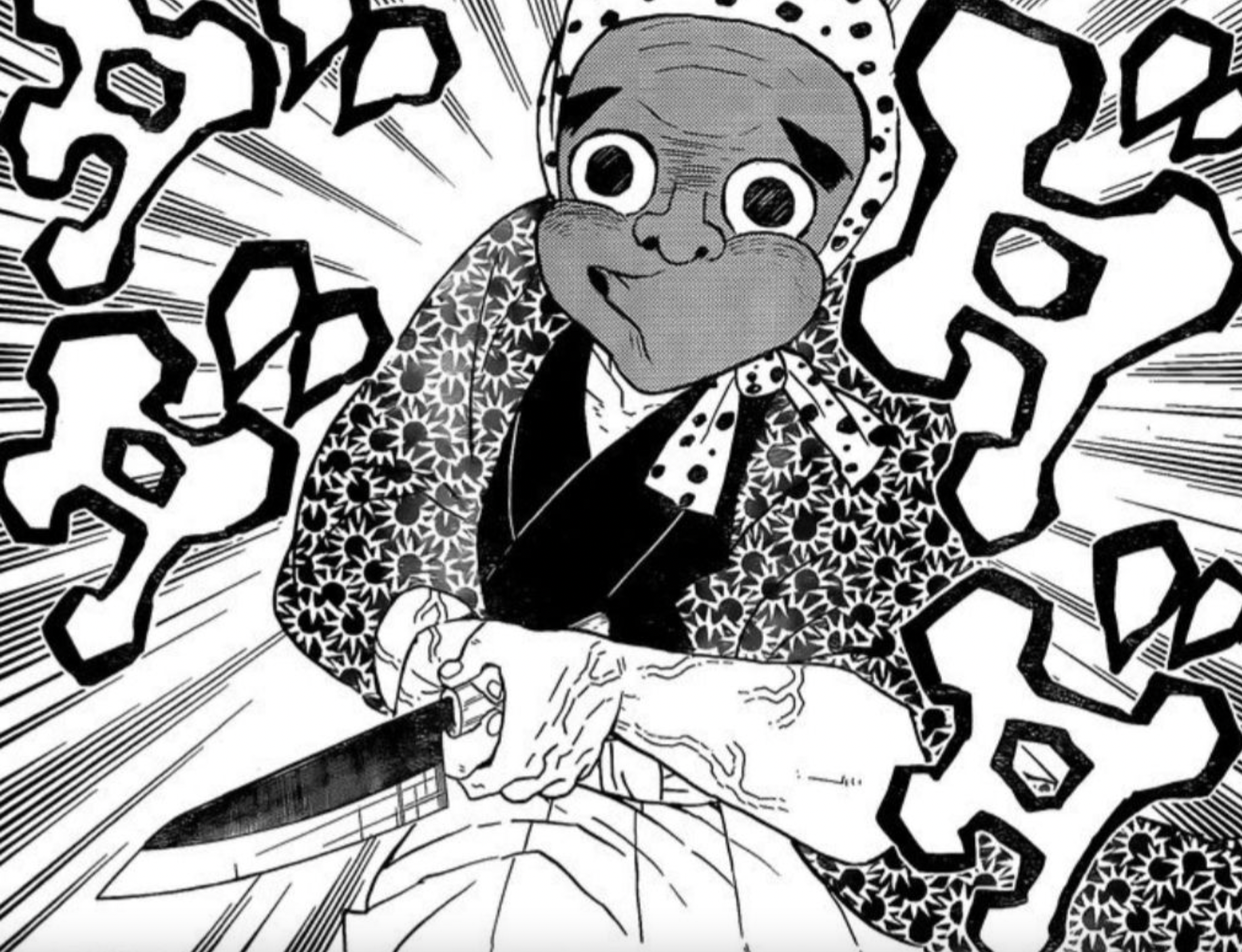 나중엔 굣코의 공격으로 가면이 깨지고 한쪽 눈이 뭉개졌음에도 신음도 없이 계속 칼을 연마하고 있는 모습을 보이는데 이때 얼굴이 공개돼 많은 팬들을 양산했다.