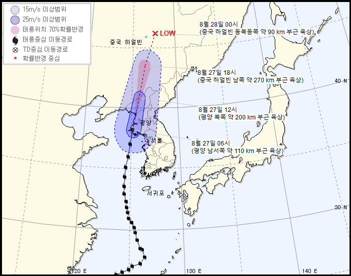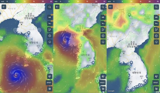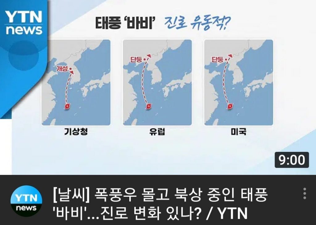 하지만 유럽, 미국, 일본 등 기상청은 북한 황해도에 상륙하지 않고 서해상을 계속해서 직진한 뒤 중국 단둥 지역에 상륙한다고 예보했다.