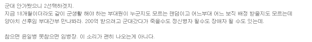 여기서 주의할 점은 ‘후자 선택시 군필은 내일 당장 재입대해야 함, 미필은 후자 선택시 군대 2번 가야 함’이라는 조건이 달렸다.