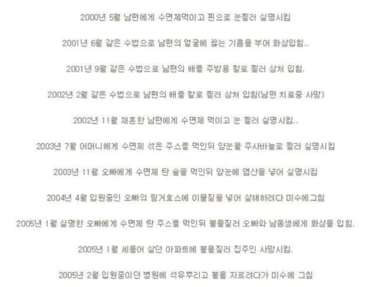 과거 SBS 방송 ‘그것이 알고 싶다’에 나왔던 살인범 엄xx(엄씨 성을 가진 여성)은 법원에서 적용한 10가지 죄목으로 무기징역을 선고 받았던 것이 방송 됐다.