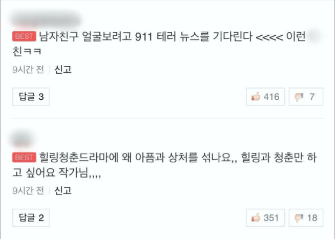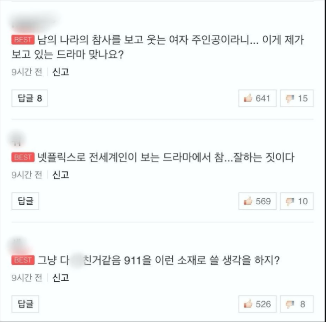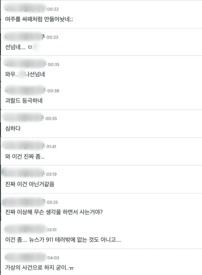 “남자친구 얼굴보려고 911테러 뉴스 기달린다” “이건 진짜 아니지;; 테러인데” “이게 넷플릭스에도 있는건데 미국 사람들이 보면 어떤 생각을 할까 ㅋㅋ”