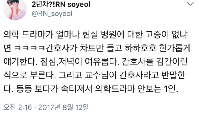 트위터나 페이스북에 간호학과 학생 및 현직 간호사들이 드라마에 나오는 간호사의 글을 보고 분노해 작성한 글이 화제다.