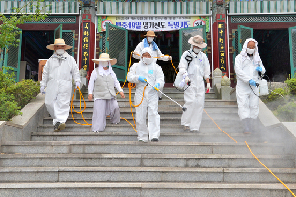 방역팀의 단장인 철산스님은 “정부의 방역 지침과 불자들의 안전을 위해 방역팀을 구성하여 방역 잡업을 진행하고 있다”고 말했다.