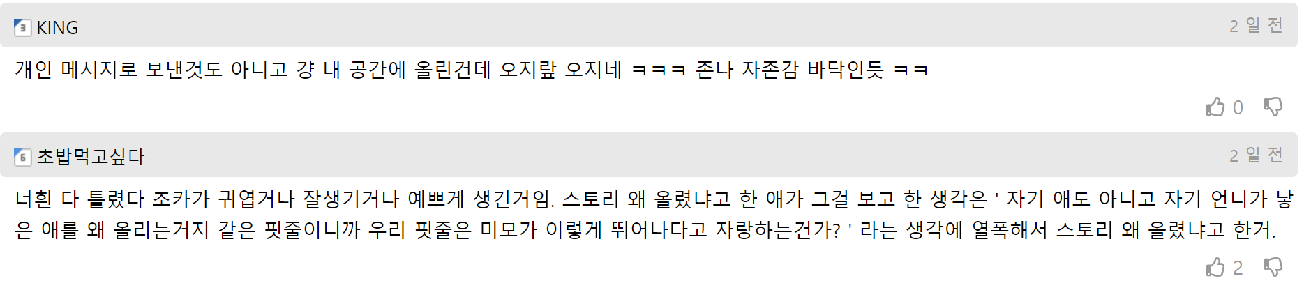 이를 본 온라인 커뮤니티 네티즌들은 “개인 메시지로 보낸 것도 아니고 개인 공간에 올렸는데 왜 저런 말을 하는 걸까요?”, “세상에는 이상한 사람이 많습니다.”라는 반응을 보였다.