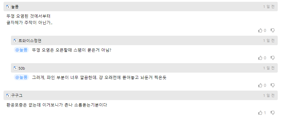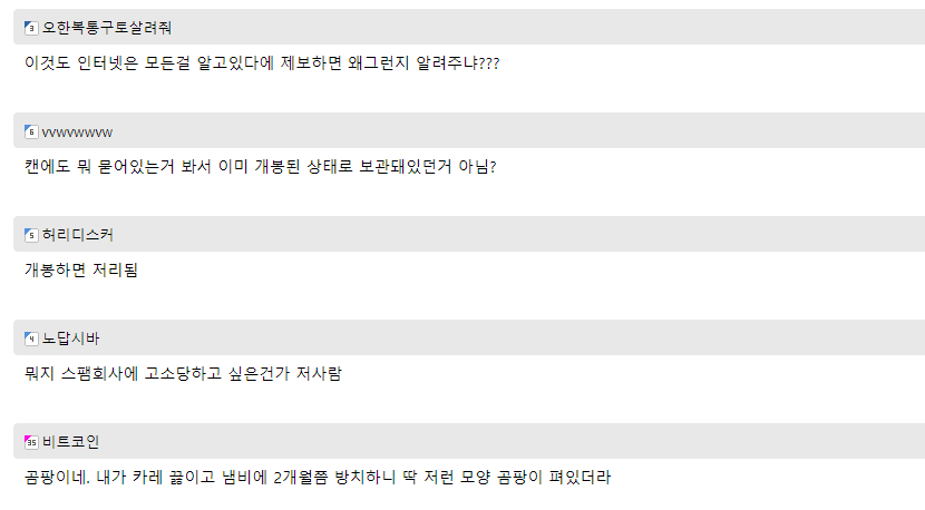 이를 본 온라인 커뮤니티 네티즌들은 “캔에 뭐가 묻은 거로 봐서 이미 개봉된 상태로 보관한 것 같네요.”, “사진을 보아하니 곰팡이인 것 같습니다. 완전 밀봉상태가 아니었던 것 같은데요?”라는 반응을 보였다.