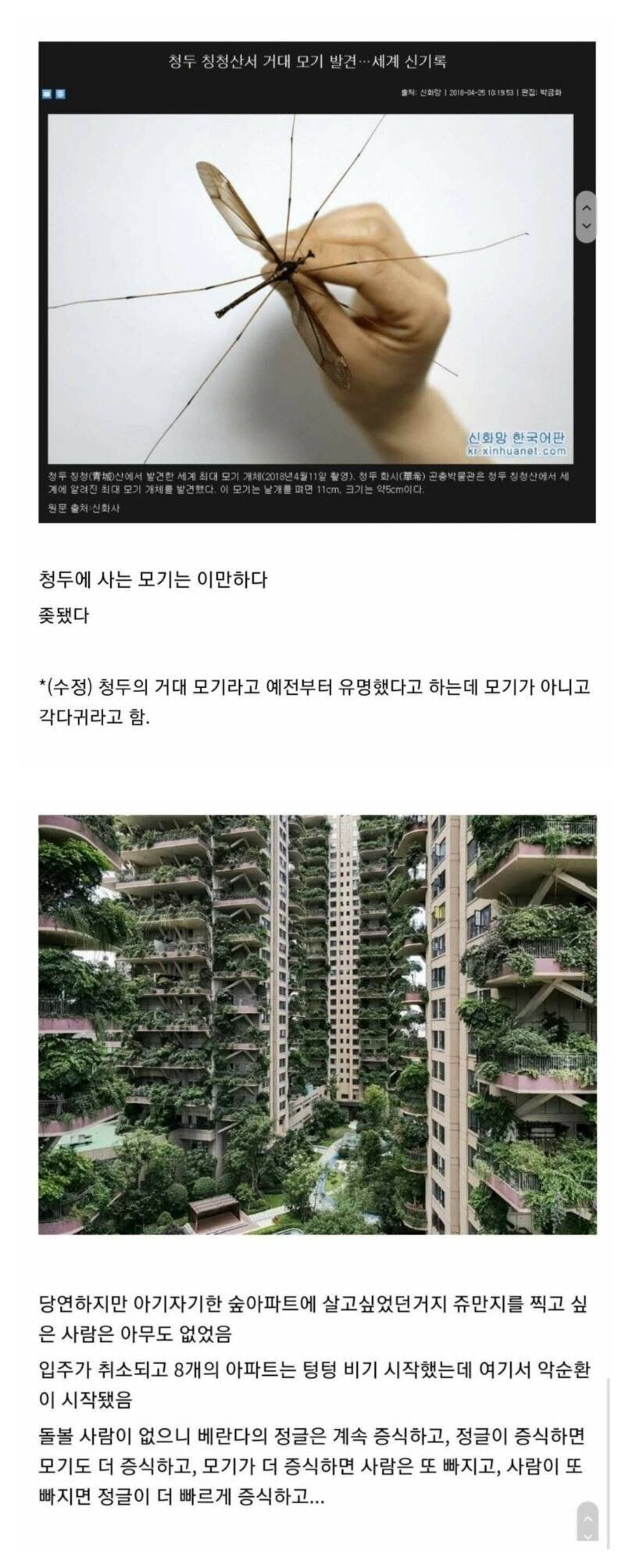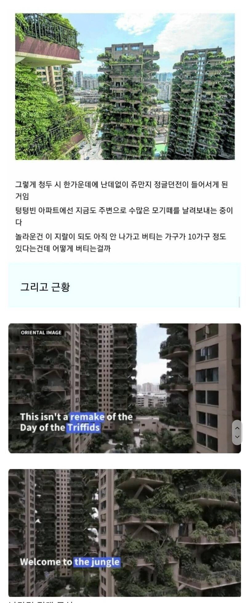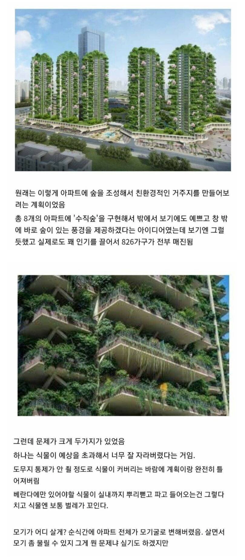 중국에서 세워진 수직 정원 즉 ‘수직 숲 아파트’가 현시점 실제 입주민은 없고 벌레와 풀만 무성해진 상태로 알려져 큰 화제다.