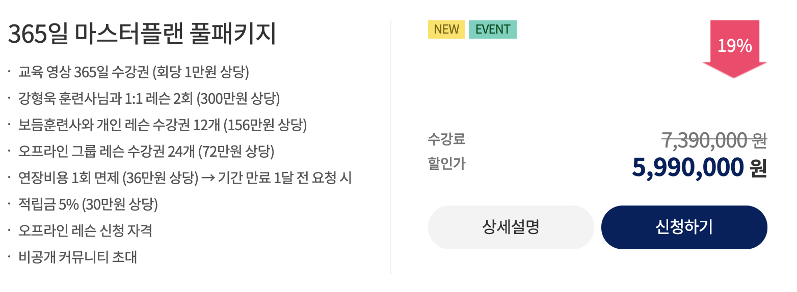 이 패키지는 교육영상 365일 수강권, 강형욱 훈련사와 일대일 레슨 2회, 이외에 훈련사와 레슨 수강 등이 포함되어 있는데 원가는 739만원으로 할인을 적용하면 599만원이다.