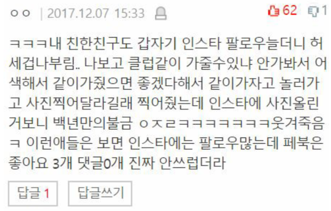 이를 본 네티즌들은 “내 친한친구도 갑자기 인스타 팔로우 늘더니 허세 겁나부림”, “저런 사람들 진짜 있음”, “진짜 이해 안간다”등의 반응들을 보였다.