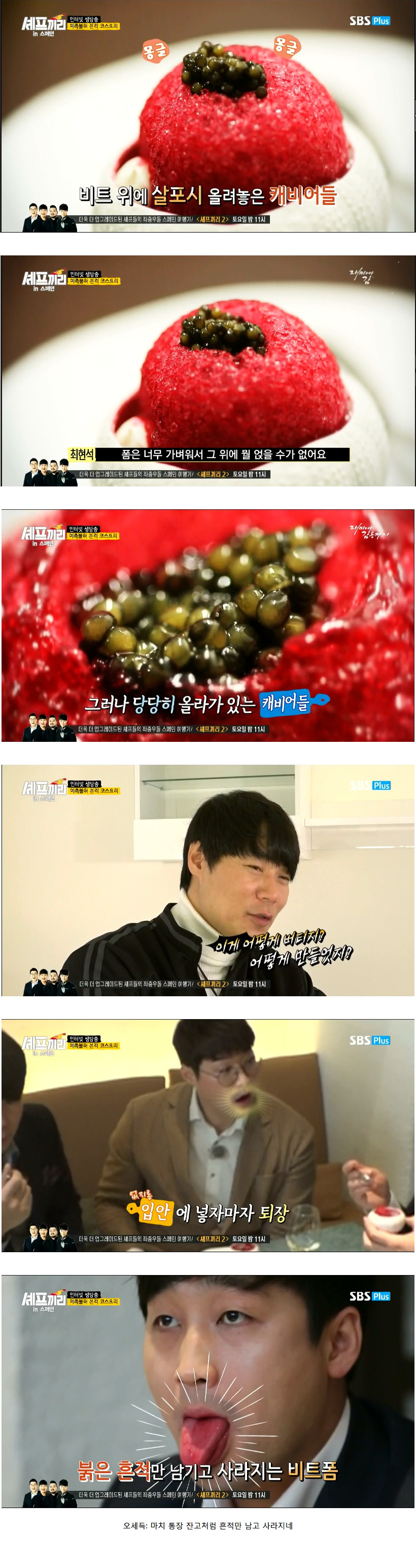 비트폼 위에 살포시 캐비어를 올려 만든 음식을 먹은 셰프들은 “먹자마자 바로 없어지는 맛이다”라고 의견을 밝혔다.