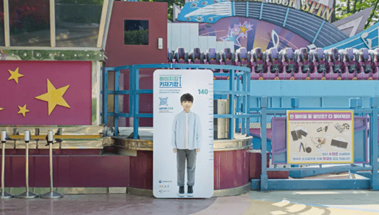 놀이공원에 놀이기구 탑승을 하기 위해서는 신장을 확인하는 키재기 판이 놀이기구 옆에 구비 되어있다.