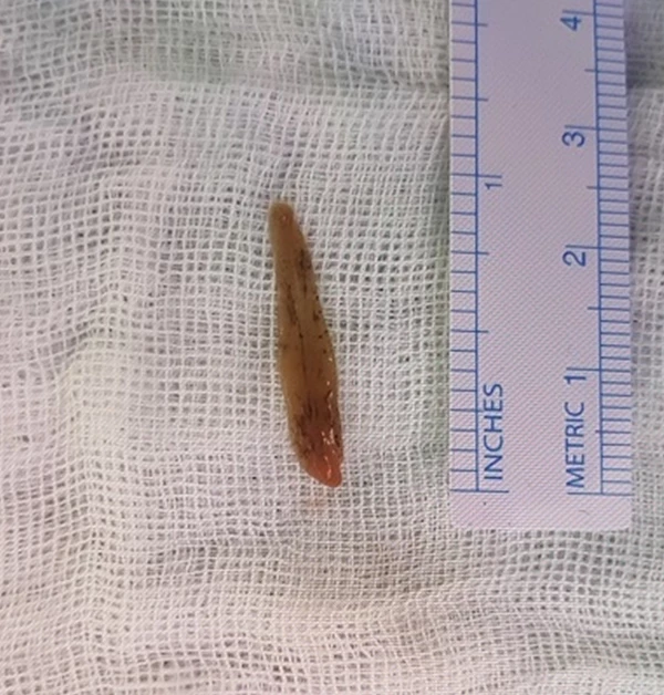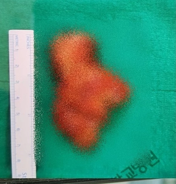 그가 공개한 사진에는 수술로 제거한 복부 염증 부위와 간질충의 모습이 담겨 있었다.