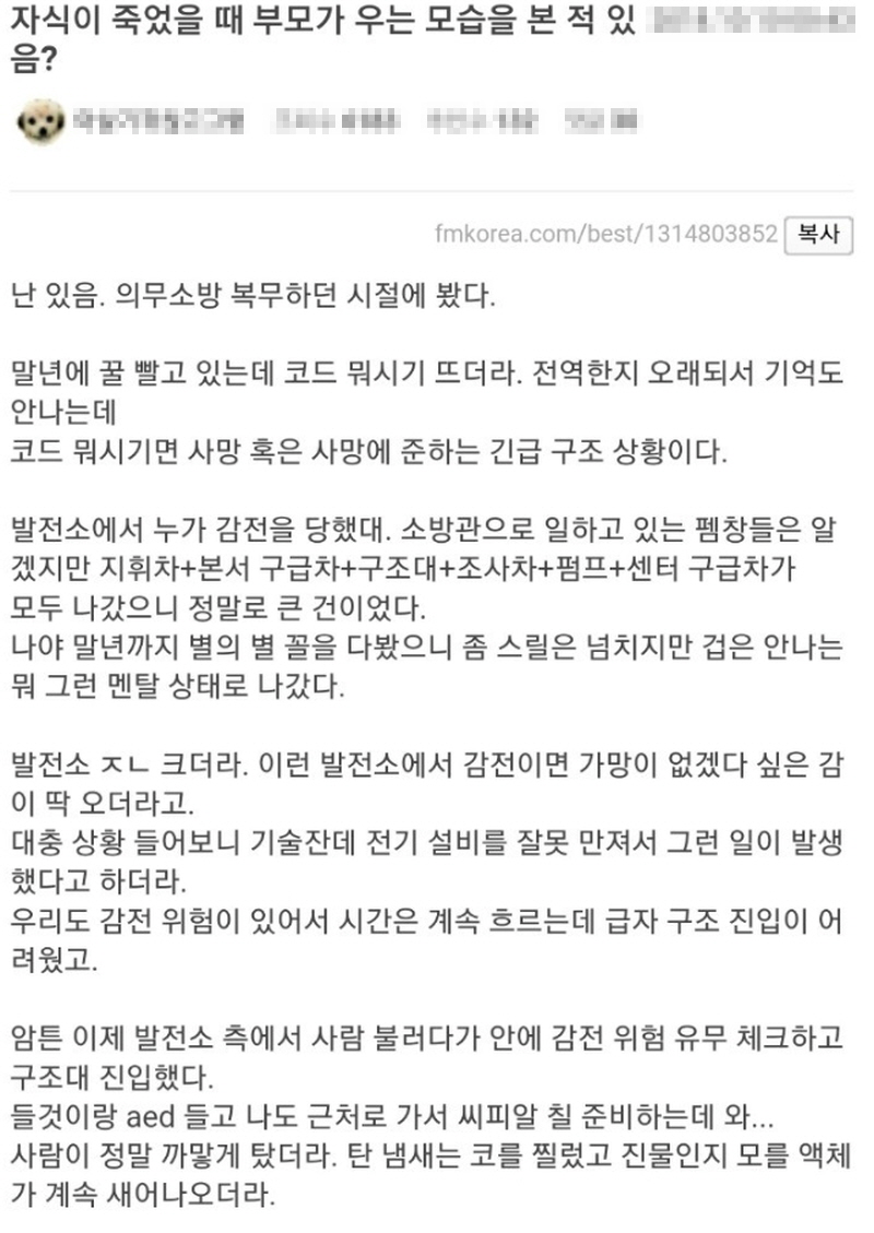온라인 커뮤니티에 “자식 잃은 부모의 모습을 본 사람 있습니까?”라는 제목으로 게시글이 올라왔다.