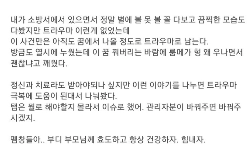 다른 소방관들도 숙연해져 고개만 숙였다며 당시 참혹한 현장을 생생히 설명했다. 그리고 ” 부디 부모님께 효도하고 항상 건강하자 힘내자”라며 글을 마쳤다.
