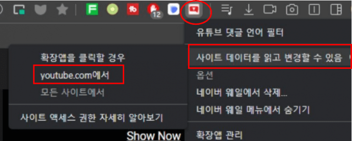 저 PC로 네이버 웨일을 실행한 다음, 웨일스토어에 들어가 ‘유튜브 댓글 언어 필터’를 추가하고 브라우저 상단에 유튜브 모양 아이콘을 클릭한 후 ‘사이트 데이터를 읽고 변경할 수 있음’을 누르고 ‘youtube.com에서’ 버튼을 클릭한다.