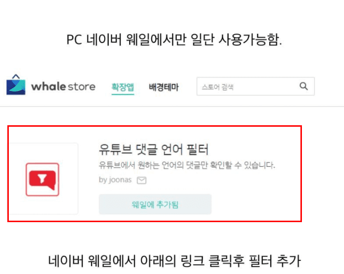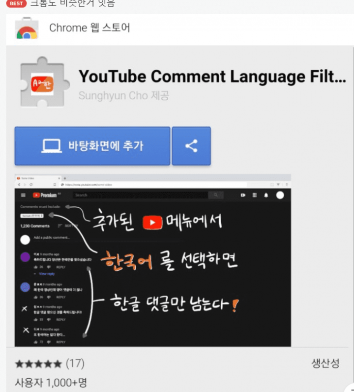 한편 크롬(Chrome)버전은 ‘유튜브 댓글 언어 필터(YouTube Comment Language Filter’)’라는 앱을 깔아 진행하면 된다고 한다.