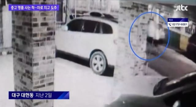 명품시계를 가지고 차에 타서 도망가는 구매자를 쫓아서 가던 판매자는 구매자의 차에 부딪혀 부상을 입었다.