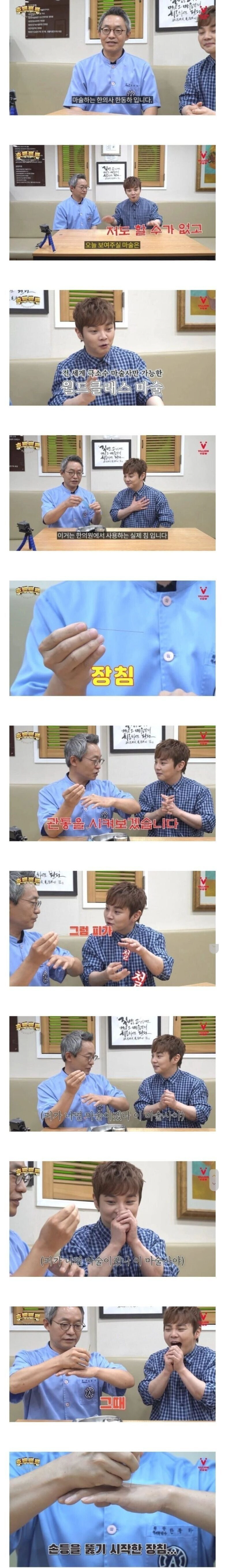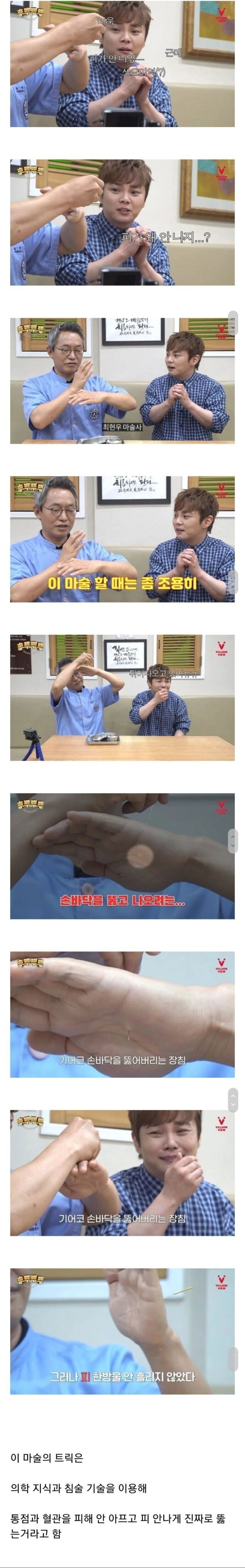 이후로 실제 장침을 이용해 자신의 손을 찌르던 한의사는 마침내 손을 모두 관통하고 나서야 “피 한 방울 나지 않고, 침으로 손을 관통했습니다.”라며 당시 상황을 전했다.